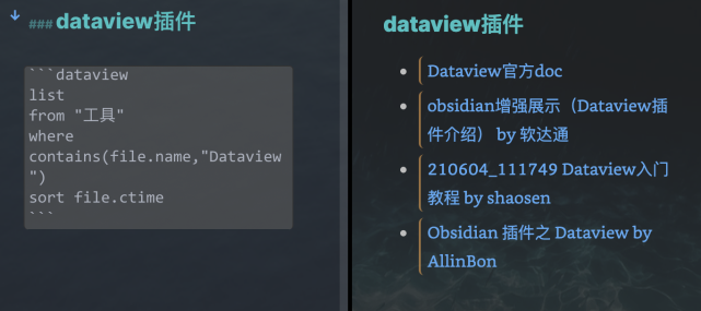 1 2 3 4 5list from "工具" where contains(file.name,"Dataview") sort file.ctime