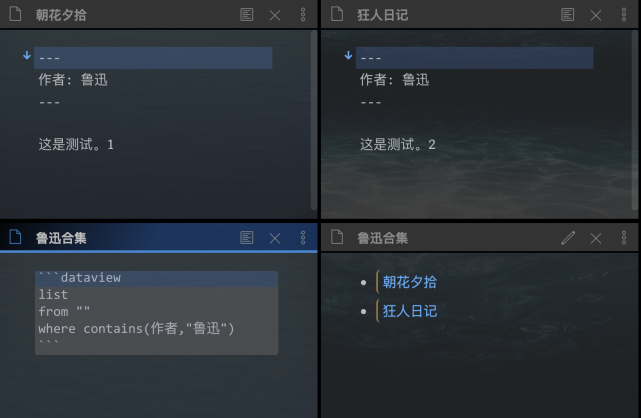 上面依次是:包含作者为「鲁迅」的原笔记、聚合作者为「鲁迅」的目录编辑模式、聚合作者为「鲁迅」的目录预览模式。